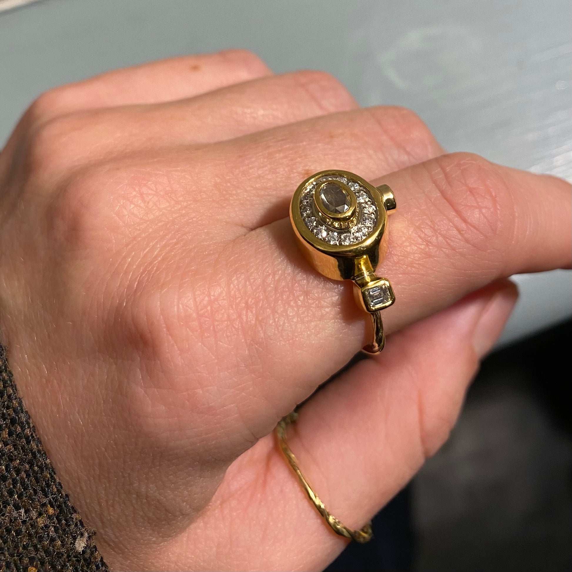 Ædelsten: 0.27 ct. rose cut diamant, 0.09 ct. cushion cut diamant, 0.10 ct. brilliantslebet diamant, 14 x 0.15 ct. TW vs brilliantslebne diamanter.