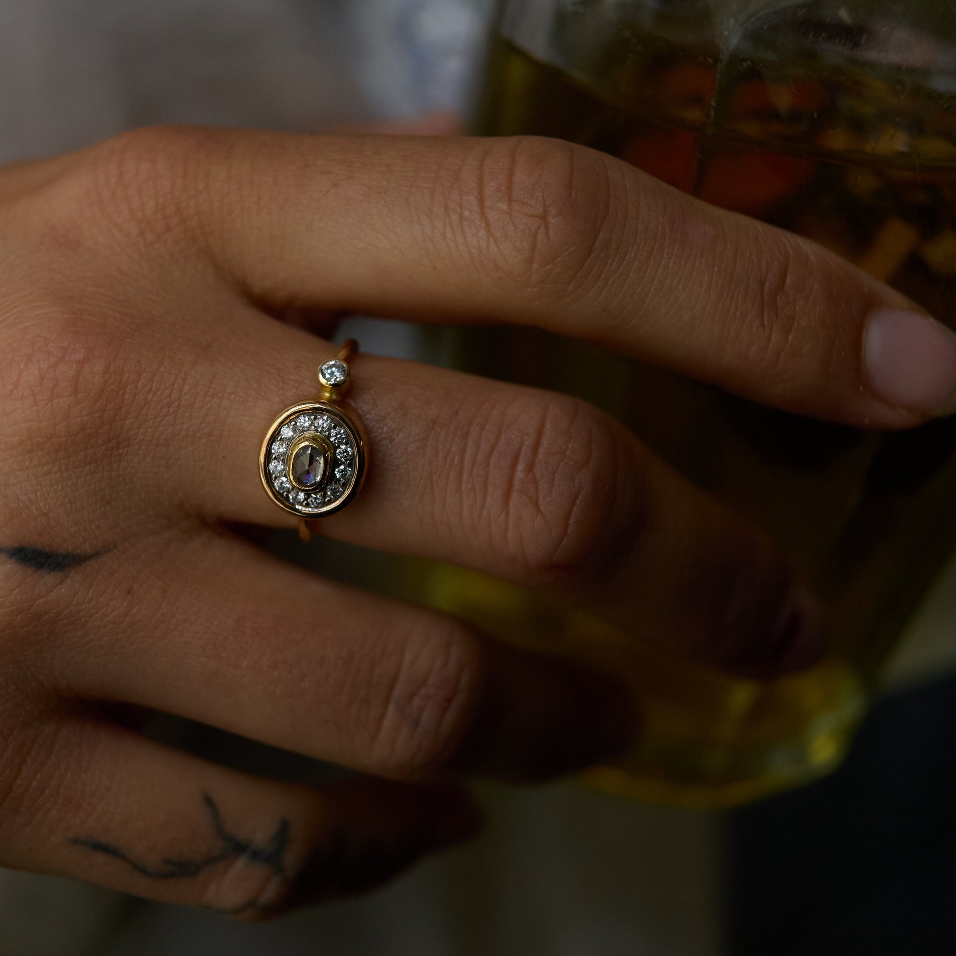 Ædelsten: 0,18 ct. oval rosecut diamant, 0,06 ct., 12 x 0,015 ct. TW vs. brillantslebne diamanter.