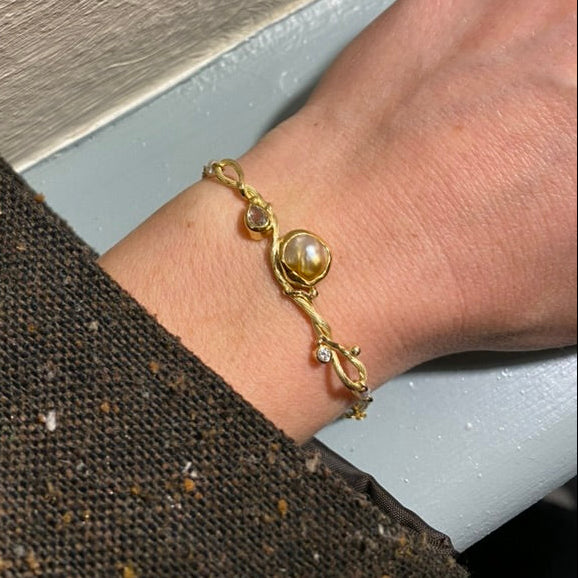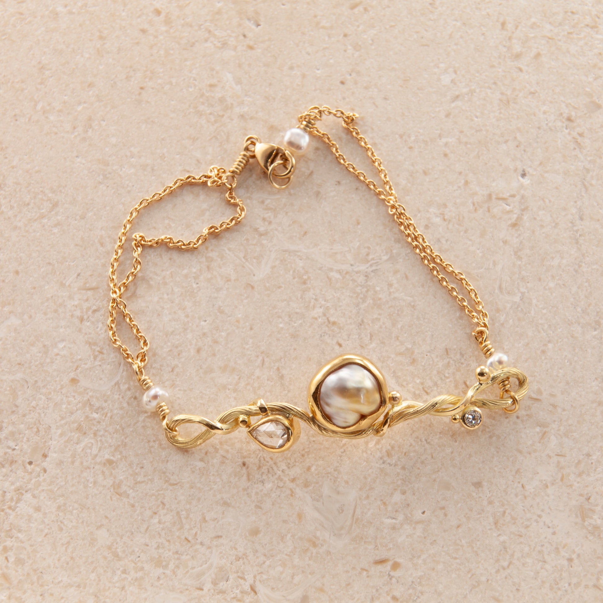 Ædelstene: 0.22 ct. rose cut Diamant, 0.04 ct. TW vs Brilliant Cut Diamant, 3 x Keshi Perler.