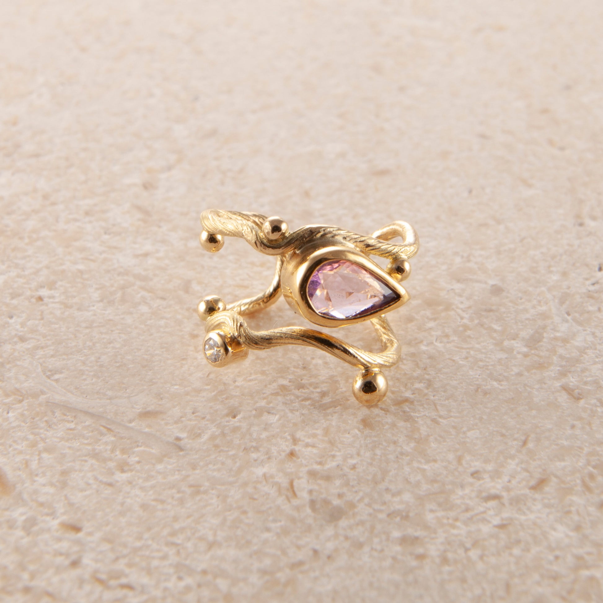 Gem: Pink pear shaped sapphire and 0.02 ct. TW vs brilliant cut diamond