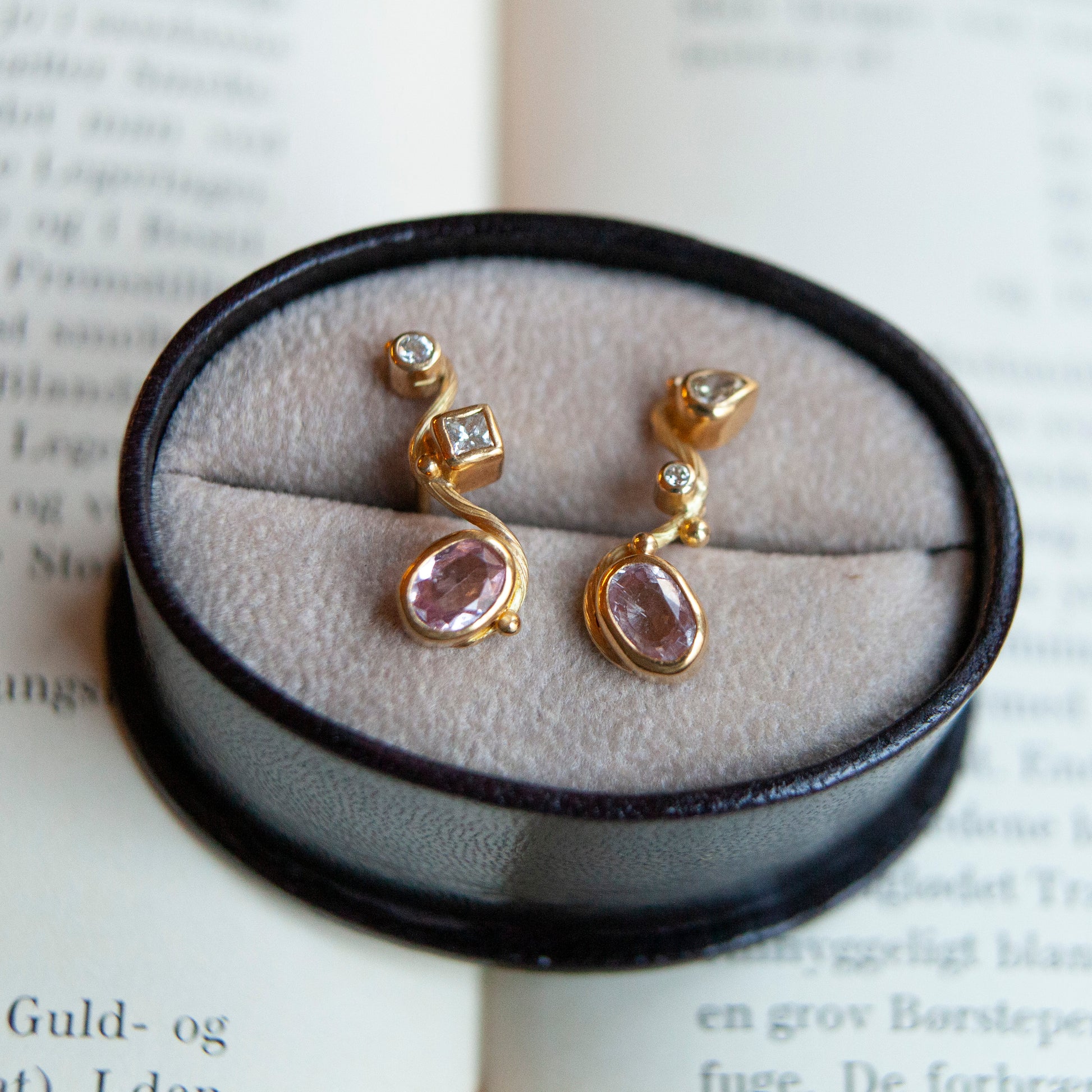 Ædelsten: Pink ovalslebne safirer, 0,17 ct. pæreformet diamant, 0,13 ct. prinsesseslebne diamanter, 0,02 ct., 0,06 ct. TW vs. brillantslebne diamanter.