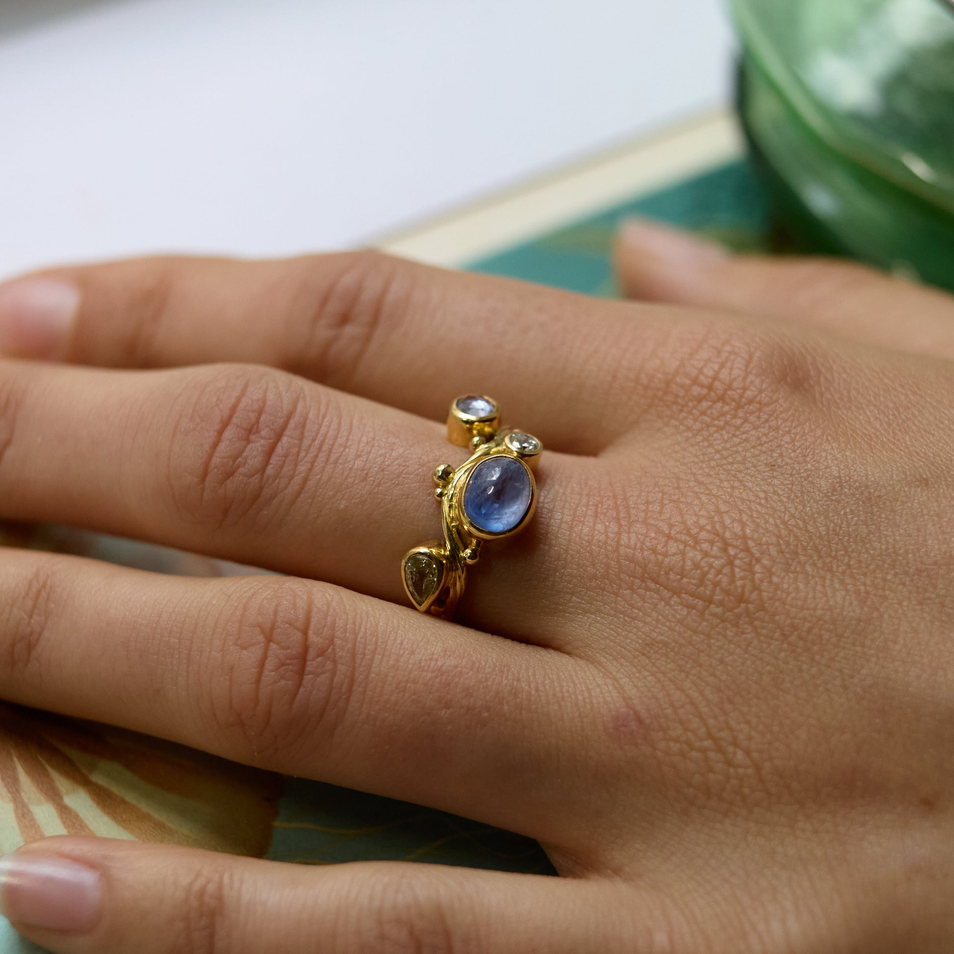 Hvert Seafire-smykke skabes som et lille landskab i bevægelse – med blinkende diamanter og farvede ædelsten i organiske opstillinger. Et dragende samspil af tekstur, lys og farve.