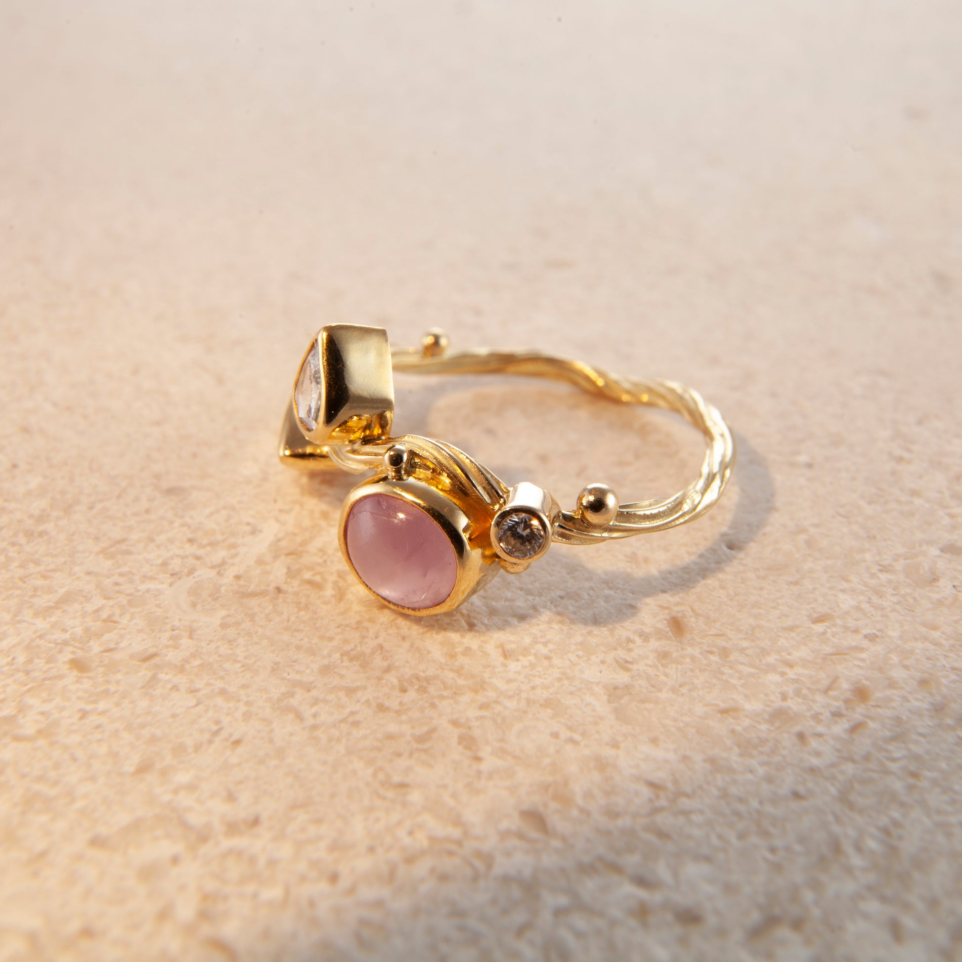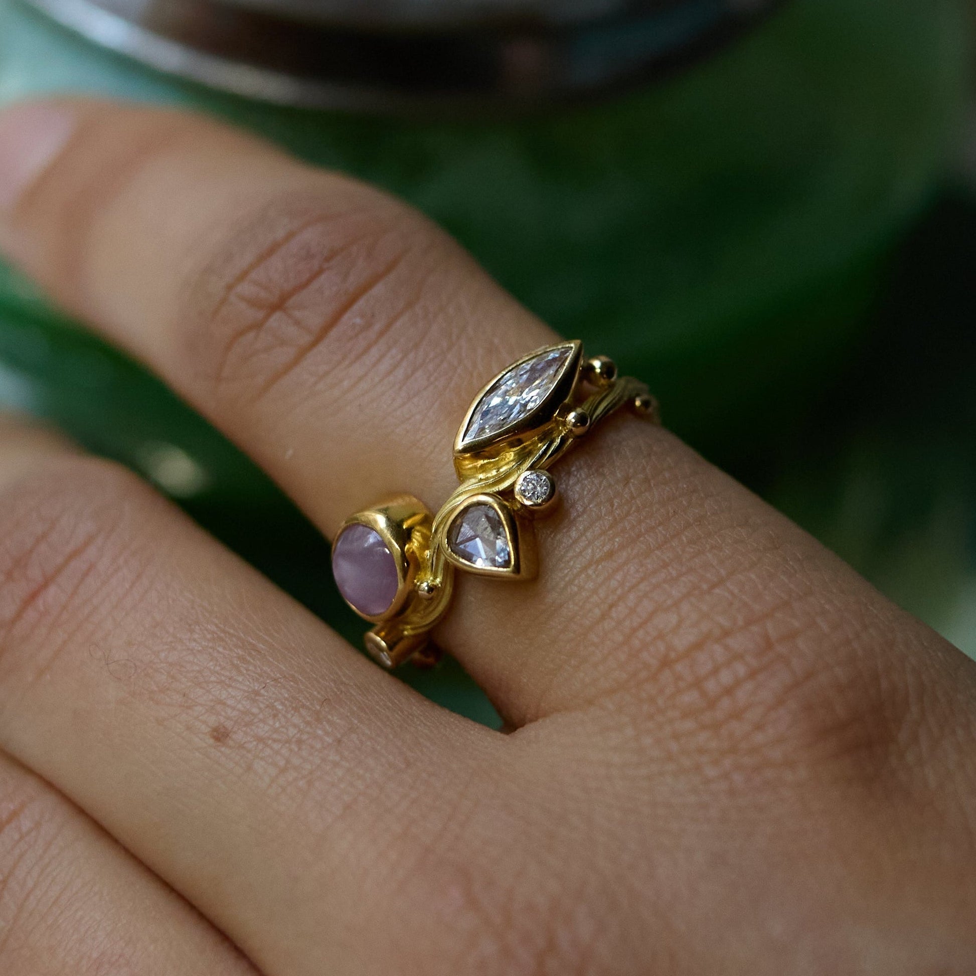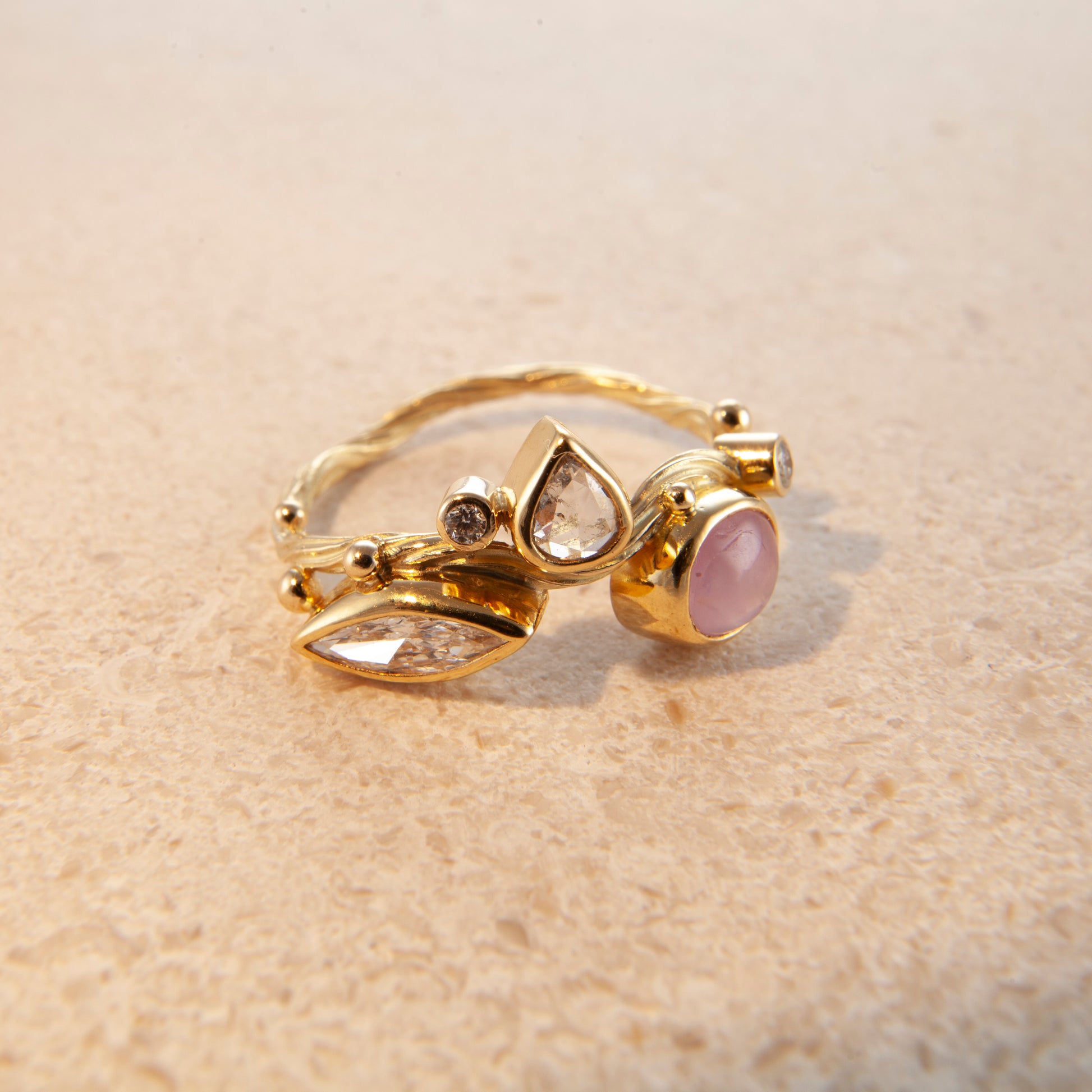 Hvert Seafire-smykke skabes som et lille landskab i bevægelse – med blinkende diamanter og farvede ædelsten i organiske opstillinger. Et dragende samspil af tekstur, lys og farve.