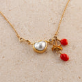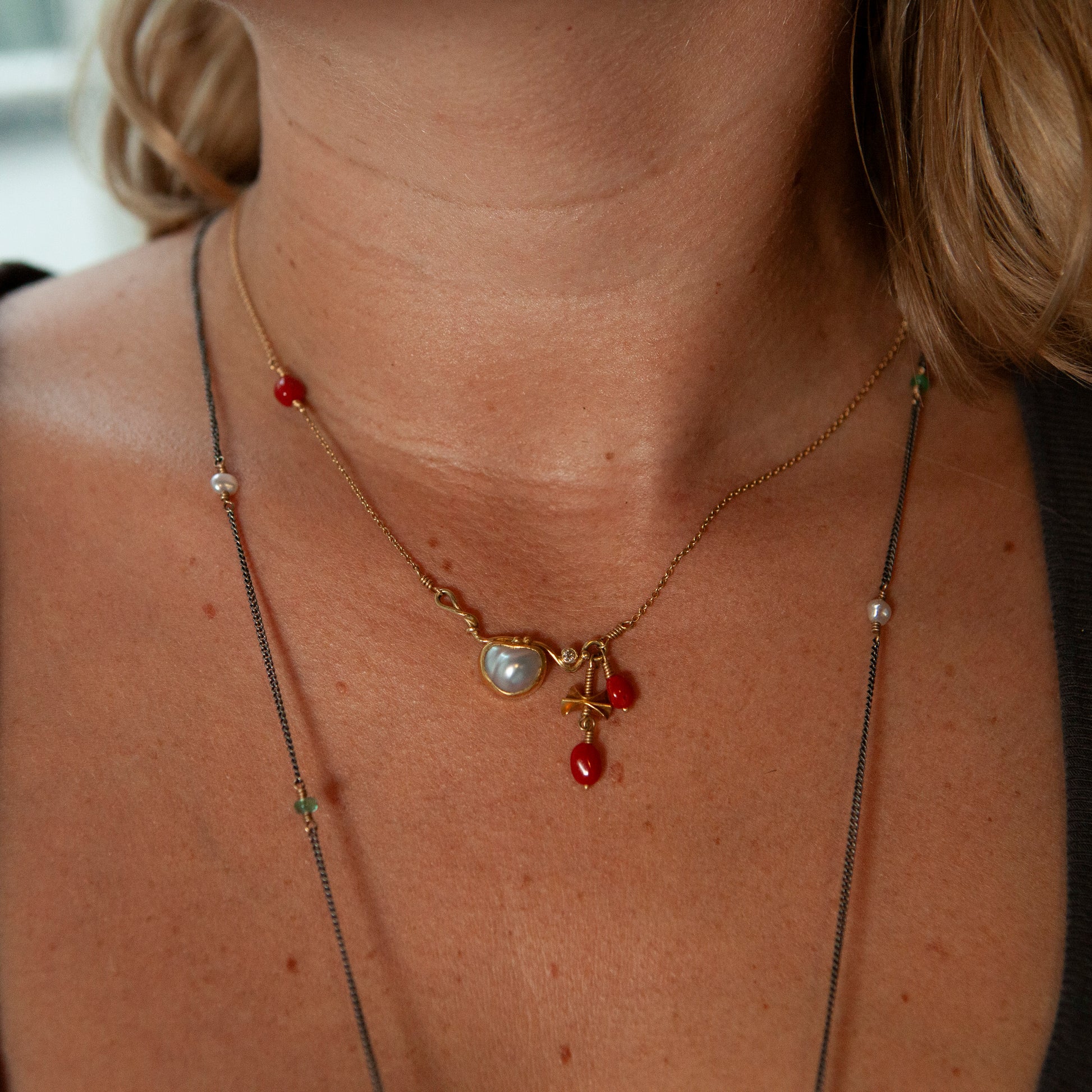 Ædelsten: Keshi-perler, koraller, 0,04 ct. champagnefarvet brillantslebet diamant.