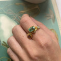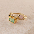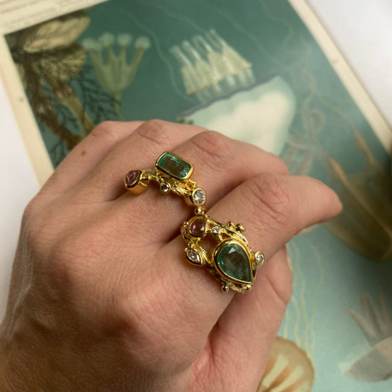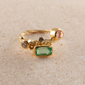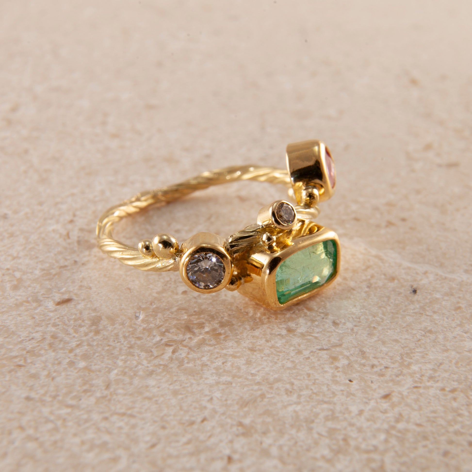 Ædelsten: 1.56 ct. Smaragd, Safir, 0.23 ct. brilliant cut Diamant, 0.04 ct. champagne brilliant cut Diamant.