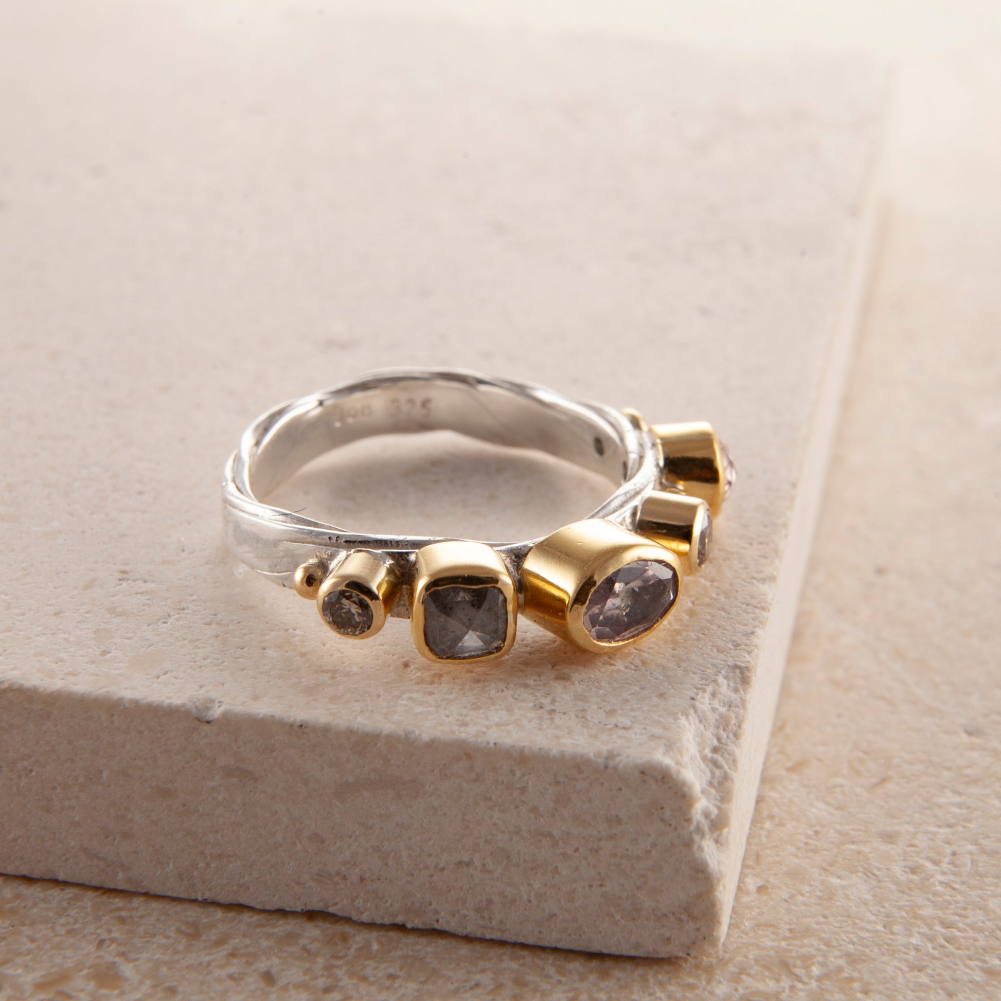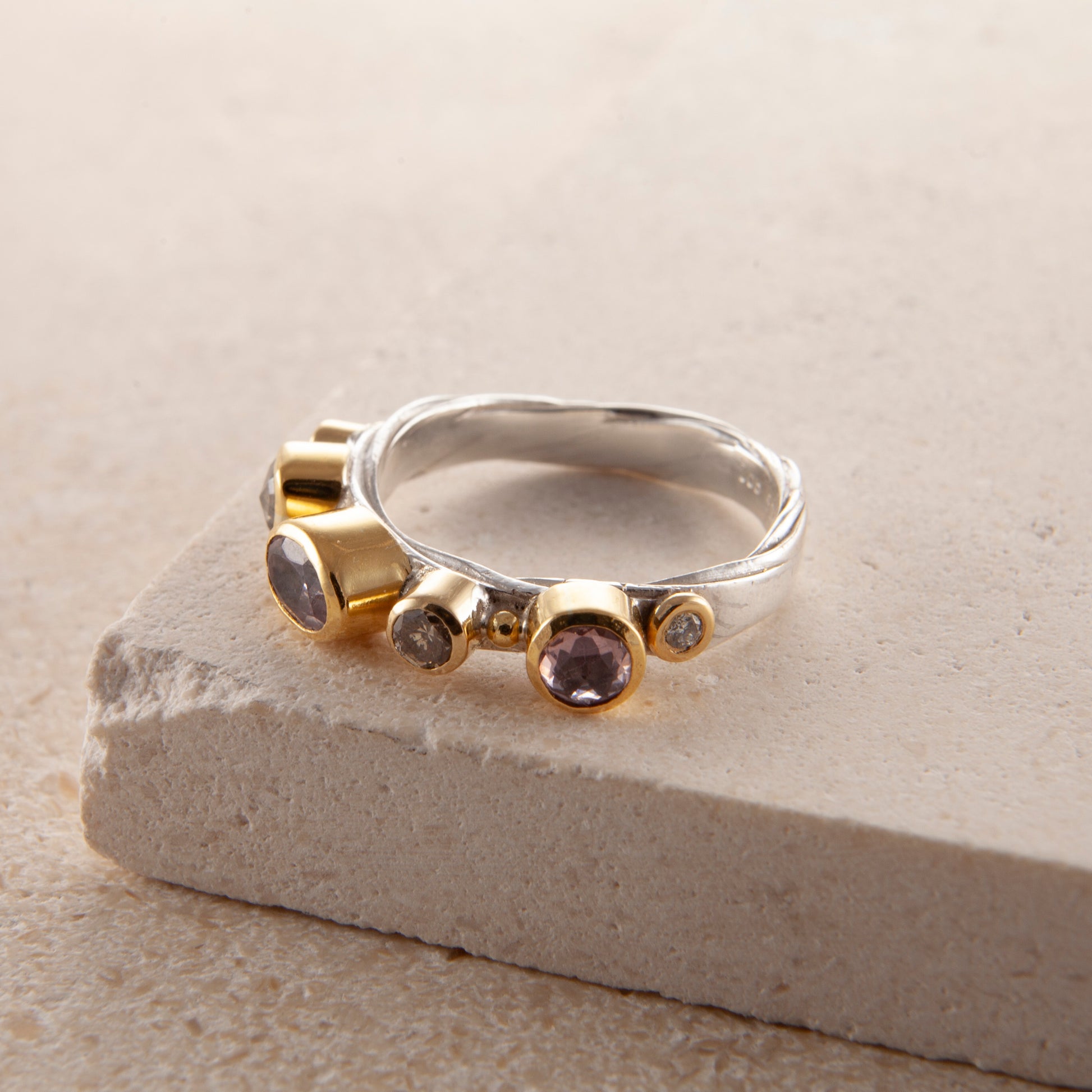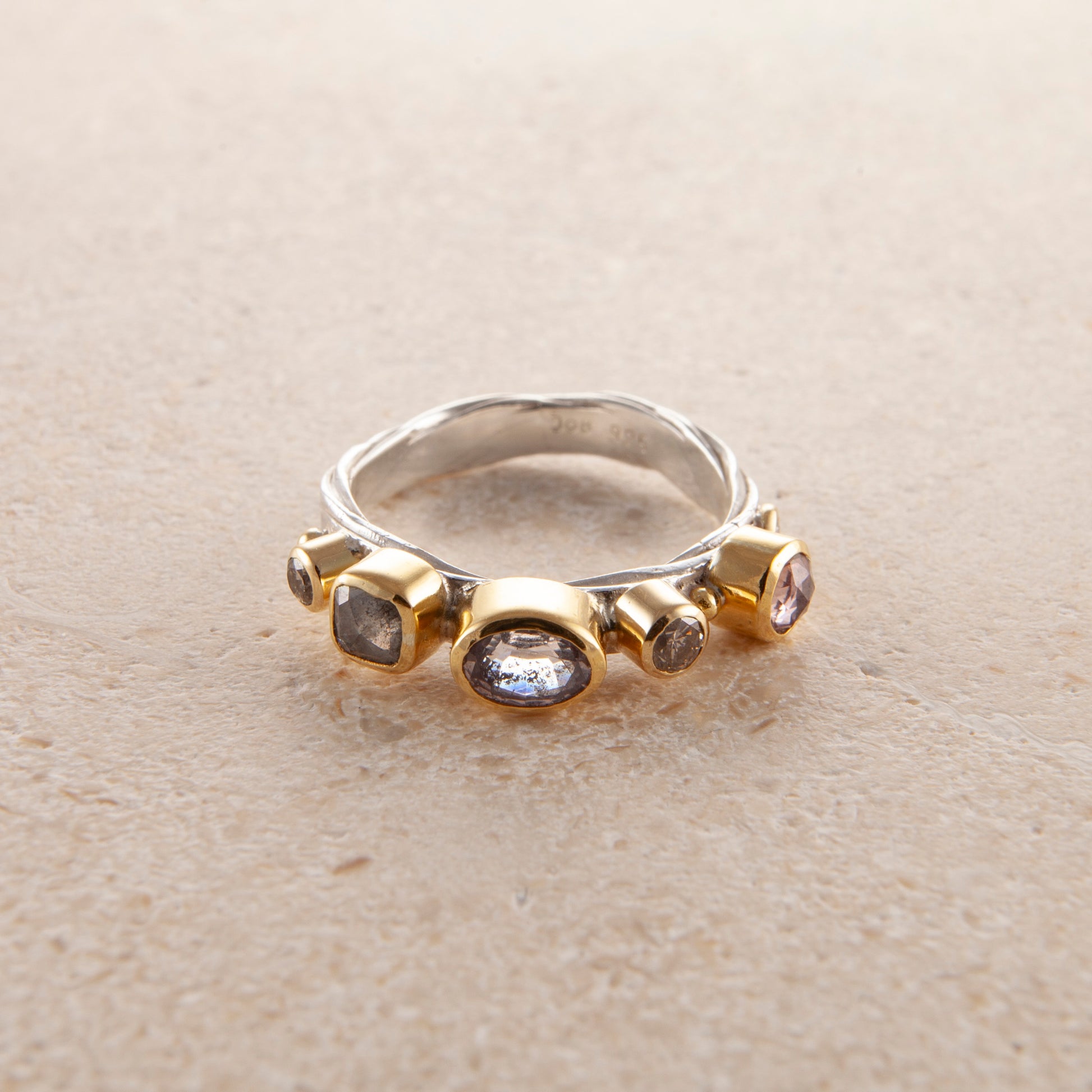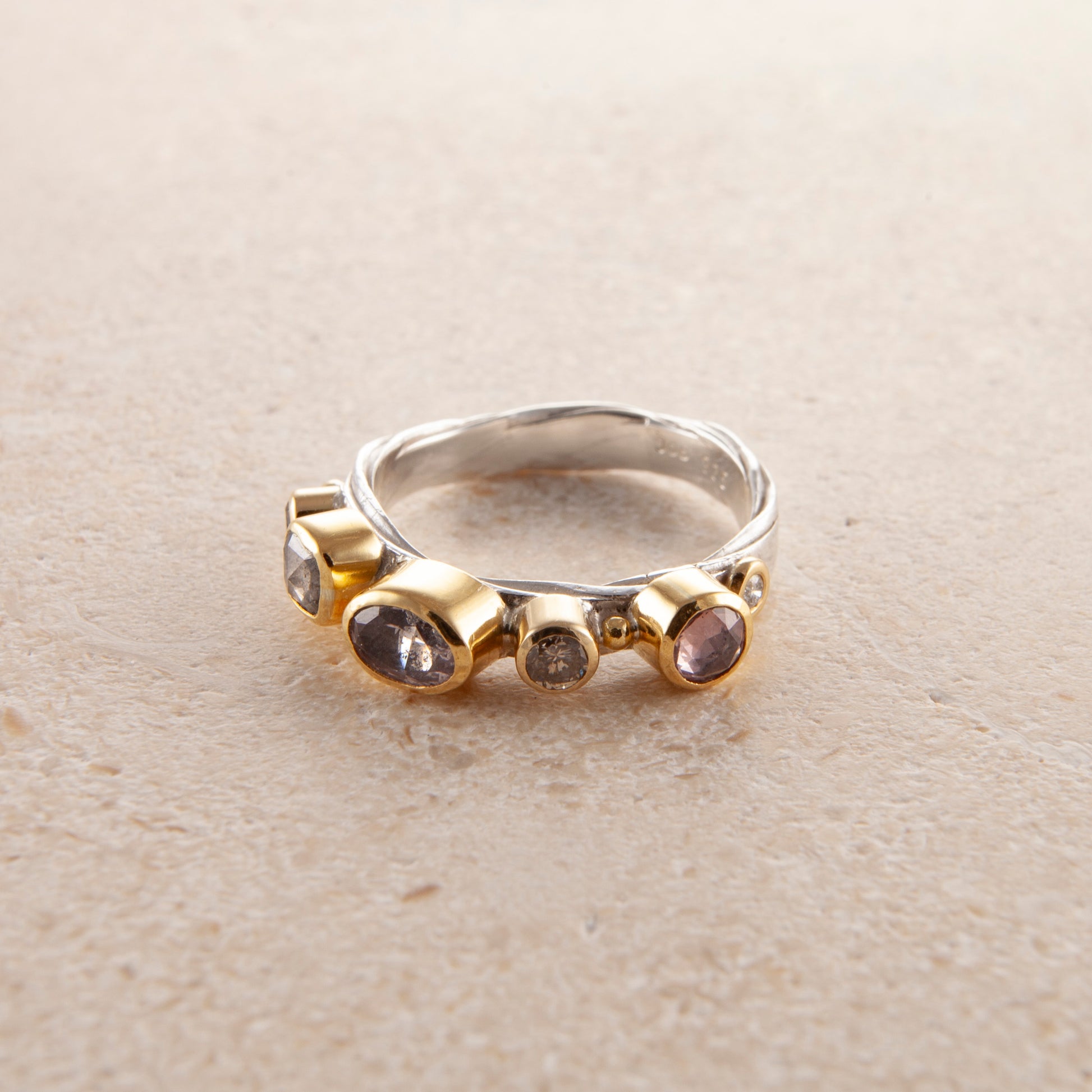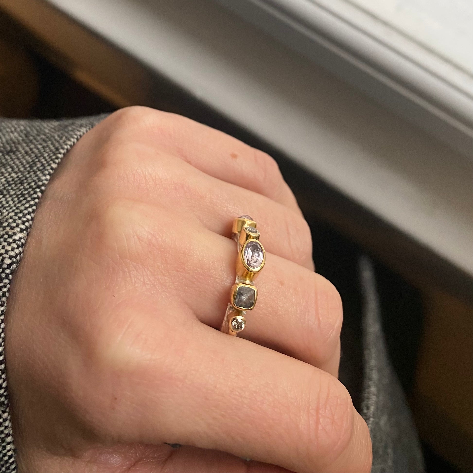Ædelsten: Oval safir, 0.23 ct. cushion diamant, pink rosecut safir, 0.06 ct., 0.10 ct. champagnefarvet brilliantslebne diamanter, 0.02 TW vs brilliantslebet diamant